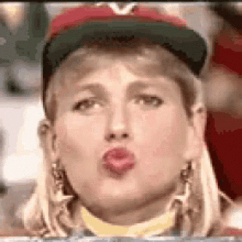 Xuxa, wearing a baseball cap and earrings, blows a kiss directly at the camera.