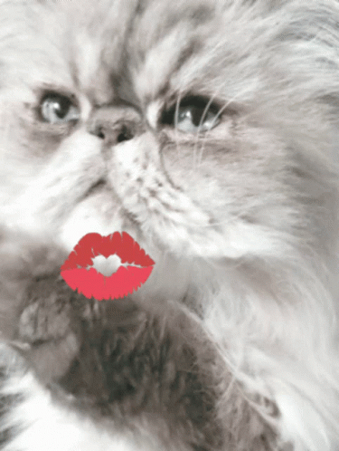 A close-up of a fluffy, light-colored cat's face, adorned with a vibrant red kiss mark on its mouth.