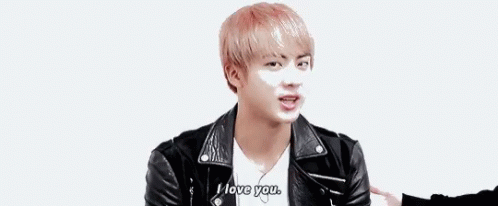 Jin, wearing a black leather jacket, looks at the camera and says "I love you."
