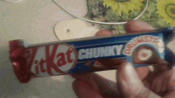 A hand holds up a Kit Kat Chunky Drumstick chocolate bar, showcasing its unique flavor packaging.