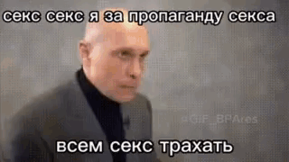 a bald man in a suit and black turtleneck is standing in front of a wall .
