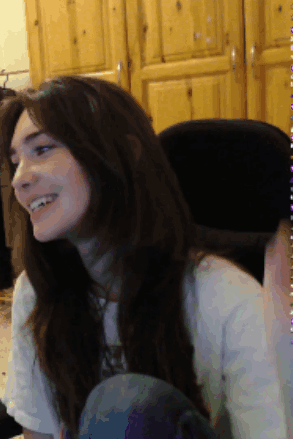 Kiwiskey, a woman with long dark hair, smiles and waves while wearing a white shirt.
