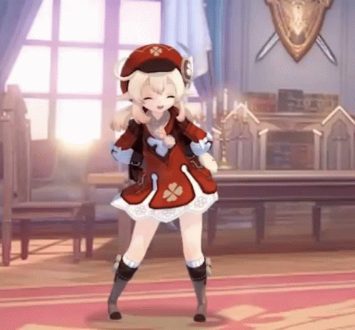 Klee, the adorable character from Genshin Impact, performs a cheerful dance in a vibrant room.