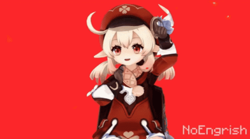 Klee from Genshin Impact performs the popular Phut Hon Dance on a vibrant red background.