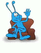 Kleks, the blue cartoon ant by Szarlota Pawel, sits comfortably in an armchair and waves hello.