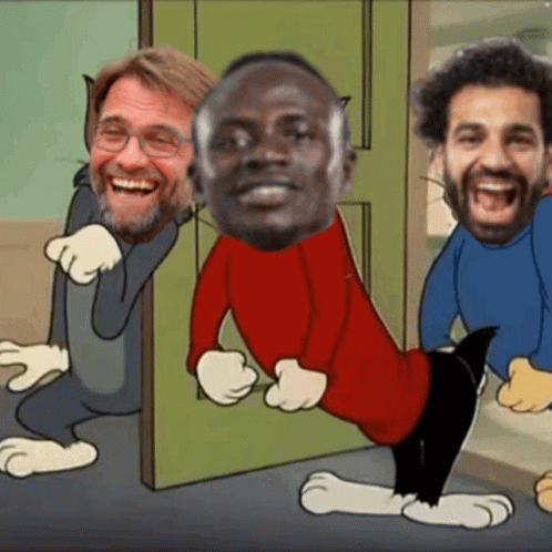 Jürgen Klopp, Sadio Mané, Mohamed Salah, and Roberto Firmino's faces on Tom and Jerry characters laughing.