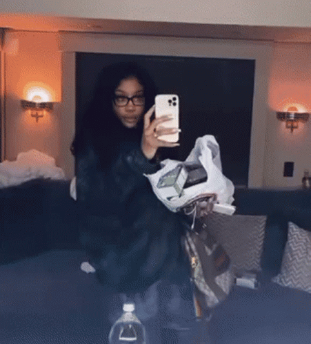 Sza captures a moment, taking a selfie with her phone while sitting comfortably.