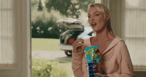 Alison Scott, played by Katherine Heigl, enjoys a bag of Munchies snack mix during her pregnancy in Knocked Up.