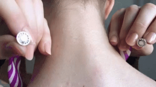 Close-up of a person fastening a purple Knottyproject7 magnetic necklace with a decorative clasp.