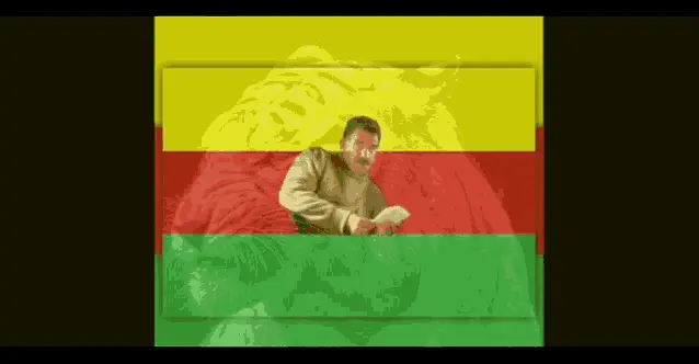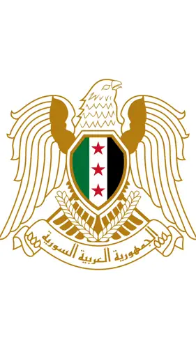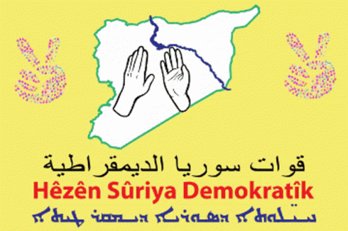 Logo of the Syrian Democratic Forces (SDF) featuring a map of Syria, praying hands, and peace signs.