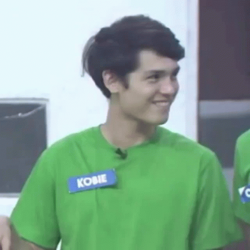Kobie Brown from PBB smiles brightly, wearing a green t-shirt with his name tag 'KOBIE' clearly visible.