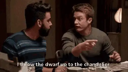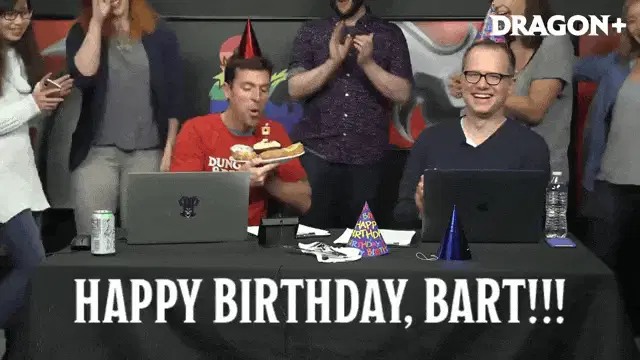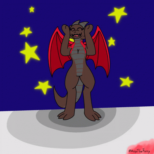 Animated Azasel, a D&D kobold character, dancing with red wings and a starry blue background.