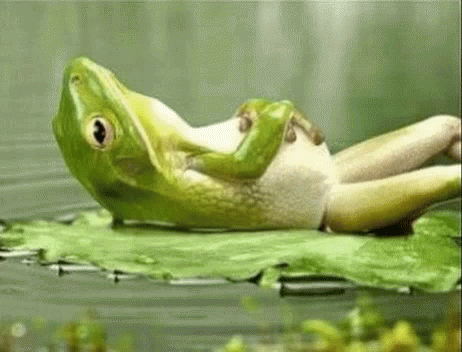A green frog relaxing on a lily pad, then reacting humorously to being 'tricked' with Indonesian text overlays.