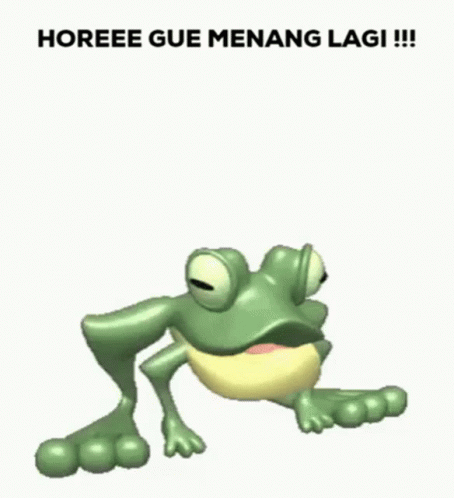 An animated frog celebrates its victory with the text 'Hooray, I won again!!!' displayed.