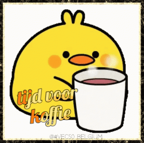 A cute yellow chick holds a steaming cup of coffee, with the text 'time for coffee' and 'VEC50 BELGIUM'.