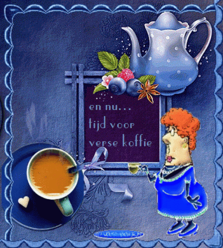 A cartoon woman with red hair holds a coffee cup, with a sign saying 'time for fresh coffee' and a teapot nearby.