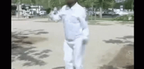 Koffiolomide Olivier, also known as Koffi, dances in a park while wearing a white outfit.