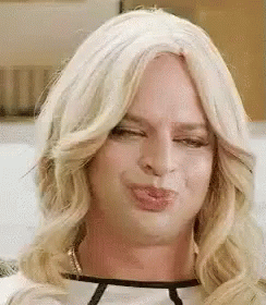 A person with blonde hair makes a funny, puckered face and nods sarcastically.