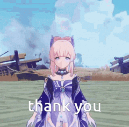 Kokomi from Genshin Impact bows and performs a gesture with a glowing fish, with 'thank you' text overlaid.