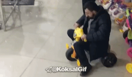 Koksal Baba hilariously attempts to ride a small tricycle, getting pushed by a friend and crashing into boxes.