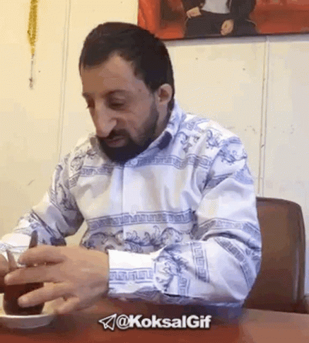 Koksal Koksalbaba drinks tea, then points and reacts with a smile.