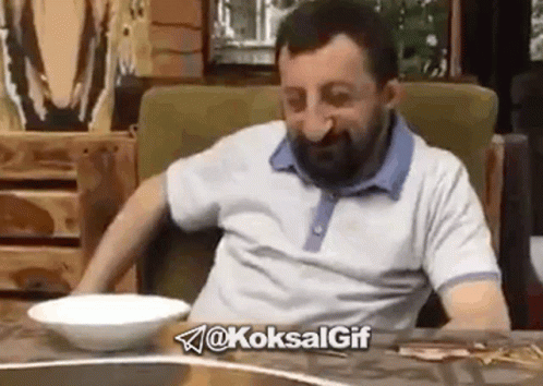 Koksal Baba makes a thankful or prayer gesture while sitting at a table with a bowl in front of him.
