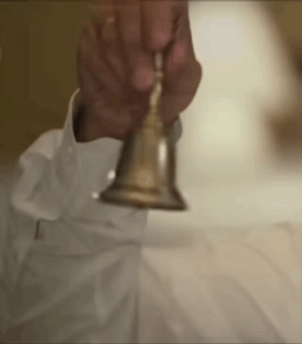 A person's hand rings a small golden bell.