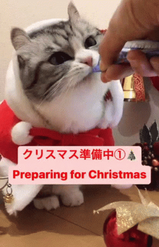 Komaru Cat, dressed in a Santa outfit, is preparing for Christmas and receiving a treat.