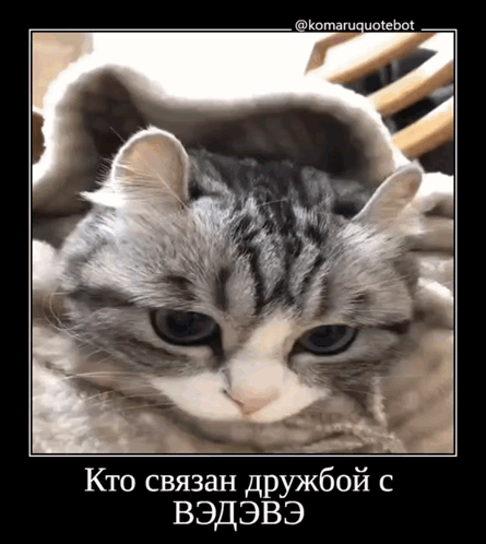 a cat is wrapped in a blanket with a foreign language caption