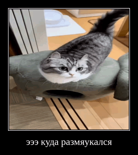 Komaru the cat, known for its unique appearance, sits on a cat bed before comically stretching out.