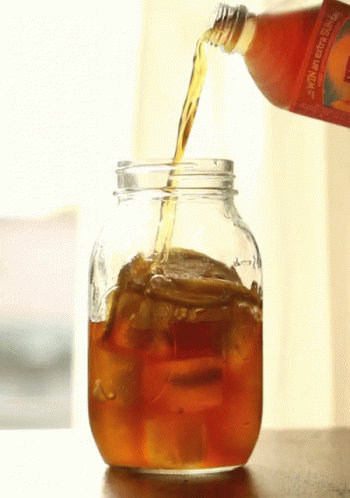 A bottle of kombucha tea is poured into a glass jar containing a SCOBY, ready for brewing or serving.