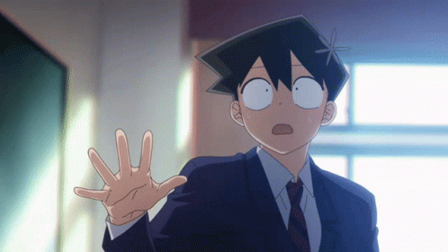 Tadano Hitohito from Komi Can't Communicate looks shocked and flustered, with wide eyes and a raised hand.