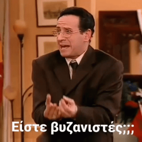 Konstantinos Katakouzinos from 'Konstantinou Kai Elenis' making a funny face with the caption 'Are you Byzantinists???'