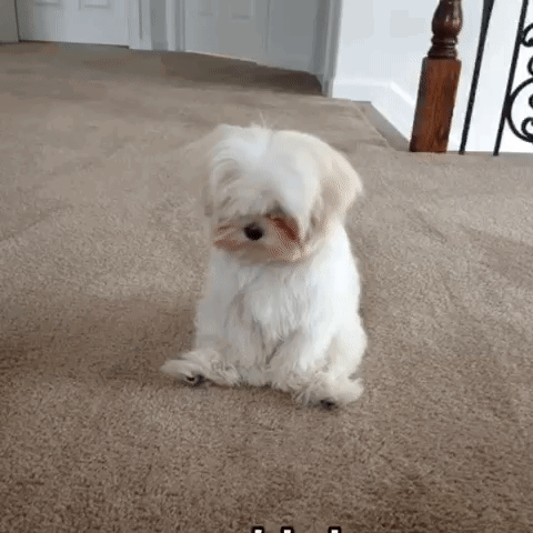Koofist, a small white fluffy dog, sits sadly on a carpet with the caption 'sad lub'.