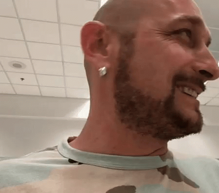 Kopicraftwork, a bald man with a beard and earrings, smiles and greets the camera with 'Hello!'