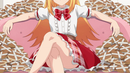 a girl in a red skirt sits on a pink couch with a pile of cookies behind her