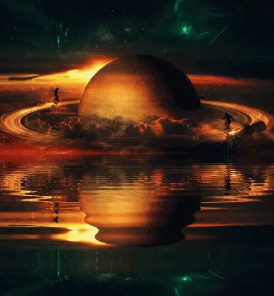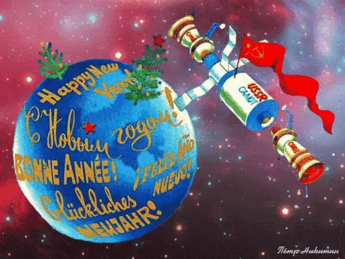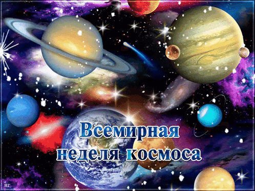A vibrant graphic depicting planets and stars, with the Russian text 'World Space Week'.