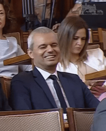 Bulgarian politician Kostadinov Kostadin bursts into laughter during a parliamentary session, covering his face in amusement.