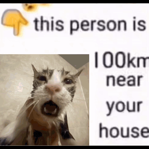 Distressed wet cat meme with text counting down distance: 'This person is 0 km near your house'.
