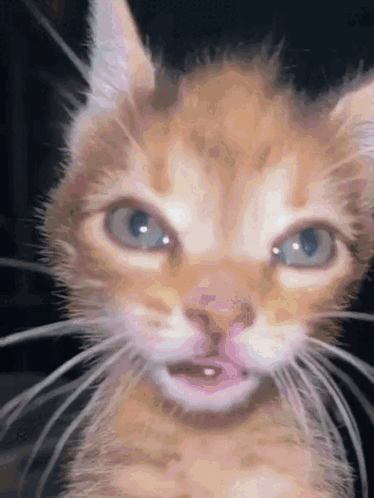 A close-up of a wide-eyed kitten with blue eyes, looking surprised or amazed.