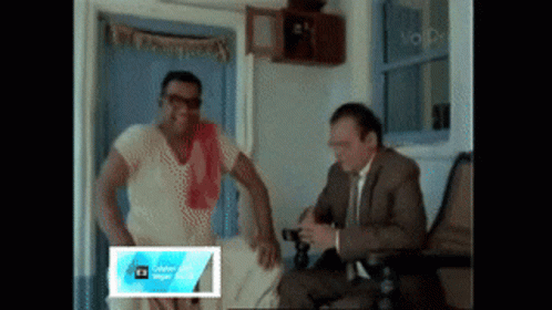 Kota Sriniivas Rao gestures animatedly while talking to a man in a suit, in a scene from 'Aha Na Pellanta'.
