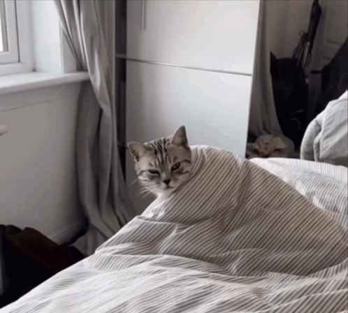A sleepy cat slowly wakes up, peeking out from under a cozy striped blanket in bed.