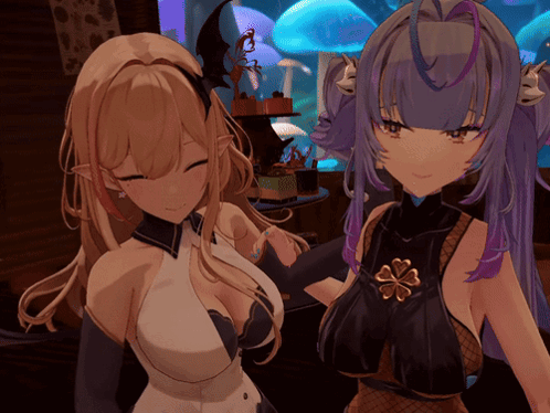 two anime girls are standing next to each other and one has purple hair