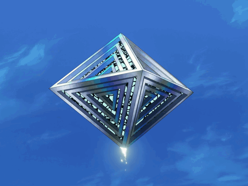 a pyramid shaped object is flying through a blue sky with a lightning bolt coming out of it