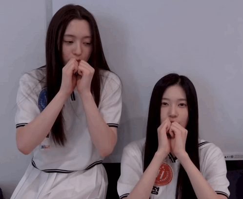 Kpop trainees Chanelle and Jeongeun from R U Next make cute hand heart gestures for the camera.