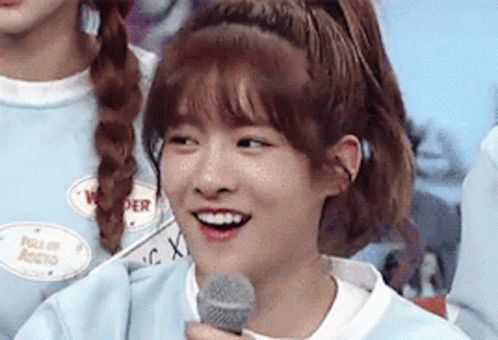 Kpop idol Exy from WJSN, wearing a light blue top, smiles and changes expression.