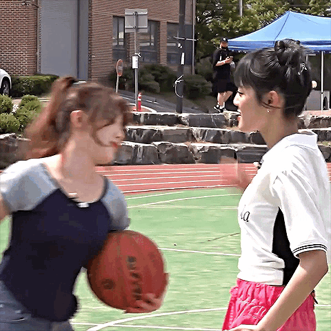 Kpop Gidle members Minnie and Shuhua share a high five on a basketball court.