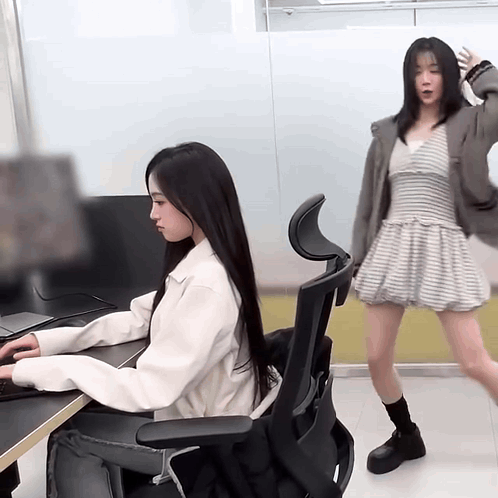 a woman in a striped dress is standing next to a woman in a white jacket