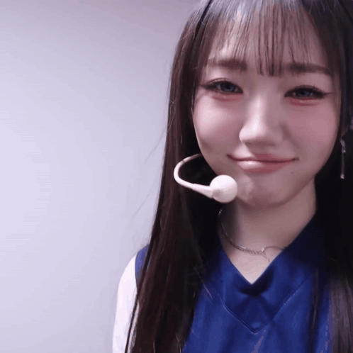 a woman wearing a headband with a microphone attached to it makes a funny face
