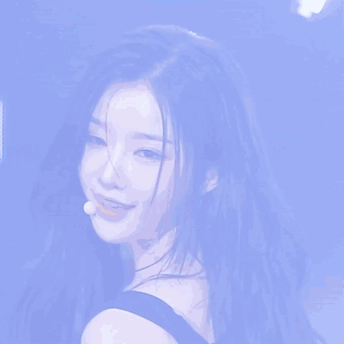 a close up of a woman 's face with a microphone